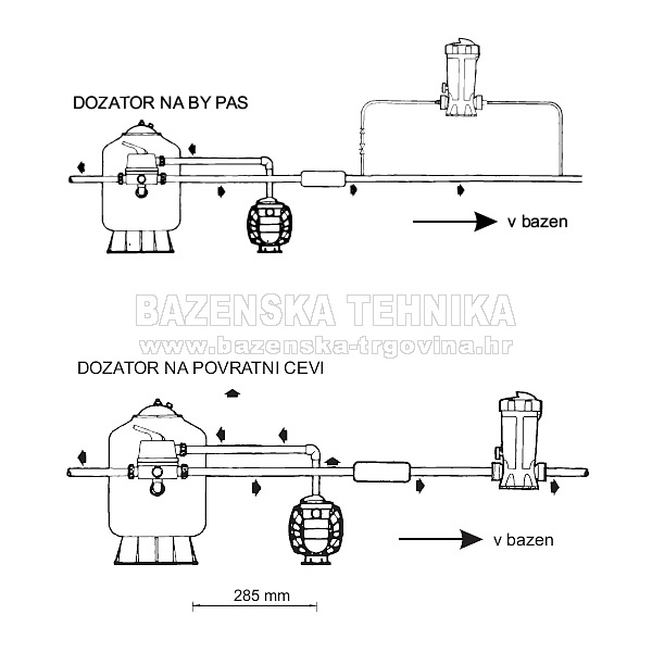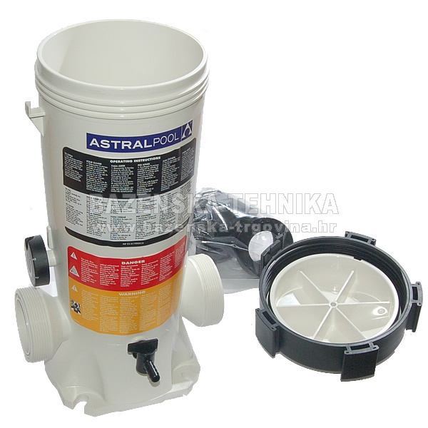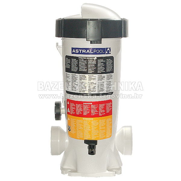 Web trgovina nudi slijedeće mogućnosti plaćanja: PPLAĆANJE PRILIKOM PREUZIMANJA PLAĆANJE PO PREDRAČUNU PREKO BANKE DOZATOR za klorove ili bromove tablete 3,5 kg - ASTRALDozator za klorove ili bromove tablete - Astral. Za jednostavnu regulaciju doziranja dezinfekcijskog sredstva na dozatoru se nalazi regulacijski ventil. Najbolje je, da je namješten na by-pass cijevi povrata u bazen, tako jednostavno odredite protok vode kroz dozator. Dozator spada među manje. Visina dozatora: 405 mm Priključci: za cijevi fi 50 - dozator je opremljen sa dva holendera sa unutarnjm navojem 1,1/2" ( preporučuje se spajanje sa spojnicom 63-50 x 1,1/2 vanjski navoj ) kapacitet: 3,5 kg 200 g tableta Dozvoljeni pritisak: max 1,5 bar