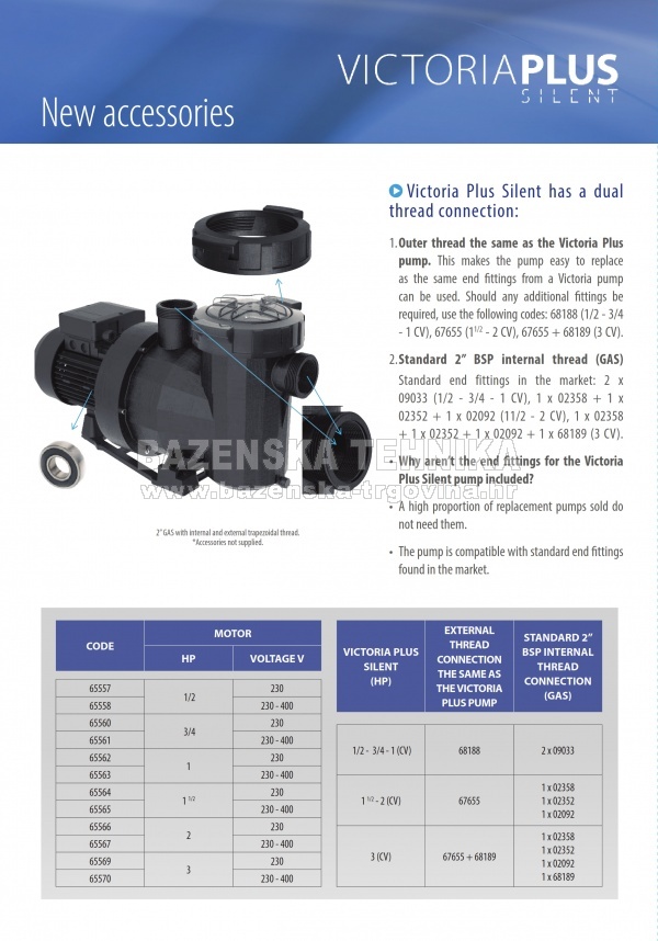 Web trgovina nudi slijedeće mogućnosti plaćanja: PPLAĆANJE PRILIKOM PREUZIMANJA PLAĆANJE PO PREDRAČUNU PREKO BANKE ![]() Bazenske crpke VICTORIA SILENT ASTRAL - TROFAZNE 400VBazenska crpka "ASTRALPOOL" VICTORIA, posebno izrađena za cirkuliranje vode u bazenima za plivanje. U kompletu sa crpkom su i holenderi na usisnom i tlačnom dijelu te podstavak. Priložen je i poseban "ključ" za lakše otvaranje pokrova predfiltera crpke.